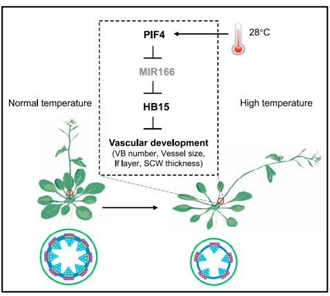 全球气候变暖对作物的生长和产量造成不利影响,从而威胁全球粮食安全。当环境温度升高时,植物通常表现出叶柄伸长、株高增加,叶片变小等表型,这些形态特征统称为植物的热形态建成。在持续的高温条件下,植株的茎秆变得更长、细弱、容易倒伏,最终会影响作物的产量。植物维管组织是植物体内负责物质运输与机械支撑的组织系统,然而,高温调控维管发育和次生壁合成的分子机制仍不清楚。