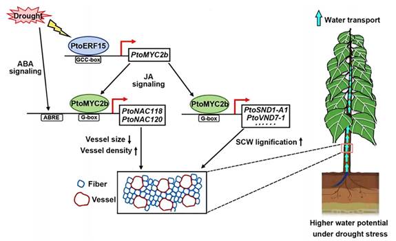 Fig.2Model of the PtoERF15-PtoMYC2b cascade modulates drought tolerance by regulating vessel morphology inPopulus.