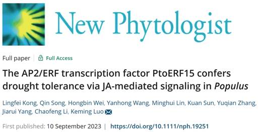 2023年9月10日,国际主流植物学期刊New phytologist(新植物学家)在线发表了西南大学beat365中国官方网站罗克明教授团队题为“The AP2/ERF transcription factor PtoERF15 confers drought tolerance via JA-mediated signaling inPopulus”的研究论文,揭示了内源茉莉酸(JA)信号在协调杨树干旱信号感知和木质部导管细胞发育中的关键作用,为木本植物的抗旱育种提供了新的潜在靶标。