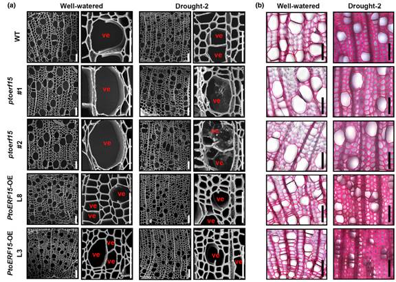 Fig.1PtoERF15 regulates xylem morphology and lignin deposition inPopulus tomentosaunder drought stress. Cross-sections were observed with a scanning electron microscope (SEM) (a) and Lignin-specific histochemical staining (b) in 3-month-old wild-type (WT),ptoerf15, andPtoERF15-OEpoplar under well-watered conditions and drought stage 2.