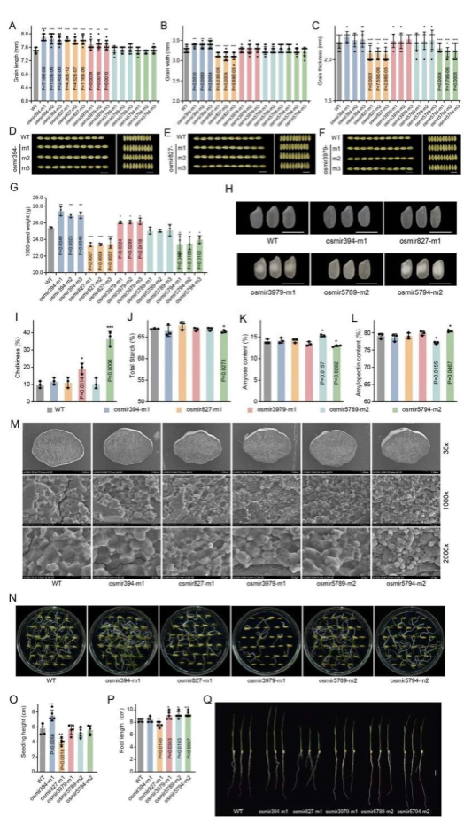 通过对OsMIR394、OsMIR827、OsMIR3979、OsMIR5789和OsMIR5794基因的功能缺失型敲除突变体进行表型分析,研究者发现这些miRNA的敲除不同程度地引起了种子大小和重量、外观品质垩白度、淀粉含量及组成、以及种子萌发和幼苗生长等方面的显著变化(图3)。揭示了这些miRNA在调控水稻产量、品质及生长发育等方面的作用及分子功能。
