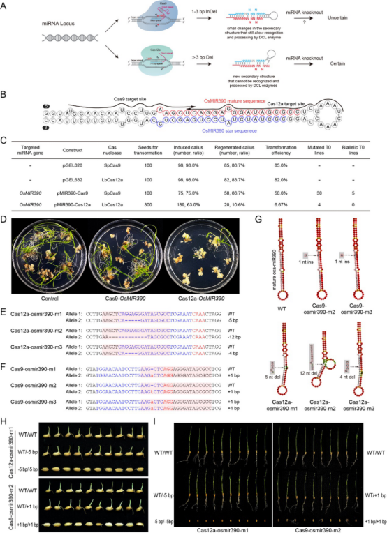 研究者对比测试了CRISPR-Cas9和CRISPR-Cas12a系统在敲除水稻OsMIR390前体基因中的效果。通过在pre-miR390茎环结构区域内设计sgRNA(用于SpCas9)和crRNA(用于LbCas12a)(图1B),发现定向编辑OsMIR390基因后,水稻再生效率均较对照下降,且Cas12a的再生效率显著低于Cas9(图1C、1D)。基因分型检测结果表明Cas12a产生的osmir390突变植株均为杂合型,突变类型为>4bp的缺失(图1E),Cas9产生的osmir390突变植株存在杂合型和纯合型,突变类型多为1bp的插入(图1F)。对突变体pre-miR390茎环结构的预测表明,Cas12a产生的碱基缺失严重改变了pre-miRNA的茎环结构,可能影响其加工成熟(图1G)。对杂合突变体的T1代种子萌发生长的检测发现,两种核酸酶产生的突变体后代分离均遵循孟德尔遗传定律1:2:1的比例。Cas12a-osmir390突变体分离出的纯合后代种子均不能正常萌发、生长,而杂合后代与分离出的WT没有差异。Cas9-osmir390突变体的杂合后代同样能正常萌发,而纯合后代中有少量种子可萌动露白并产生伸长的侧根(图1H, 1I),尽管这些Cas9-osmir390纯合突变体没有长出芽,最终也没有发育为幼苗。这一结果提示Cas9核酸酶在定向编辑miRNA基因时,虽然可以成功敲除miRNA基因,但仍可能保留部分miRNA功能。以上结果说明,相较Cas9编辑系统,Cas12a编辑系统在miRNA基因敲除获取功能缺失突变体工作中是优选工具。