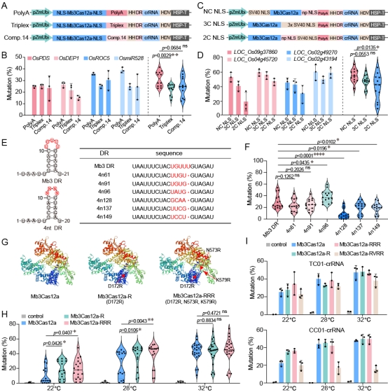 研究者进一步优化了Mb3Cas12a STUHDH植物基因组编辑系统,通过改造Mb3Cas12a核酸酶及crRNA骨架序列的关键功能元件及基序序列、核酸酶活性及稳定性相关关键氨基酸等,显著提高了Mb3Cas12a STUHDH系统的编辑效率(图2A-2F)。同时,拓展了Mb3Cas12a的适用温度范围,获得了32°C、28°C时高编辑效率的系统,以及在22°C时编辑效率超过15.0%的有效编辑系统(图2G-2I)。