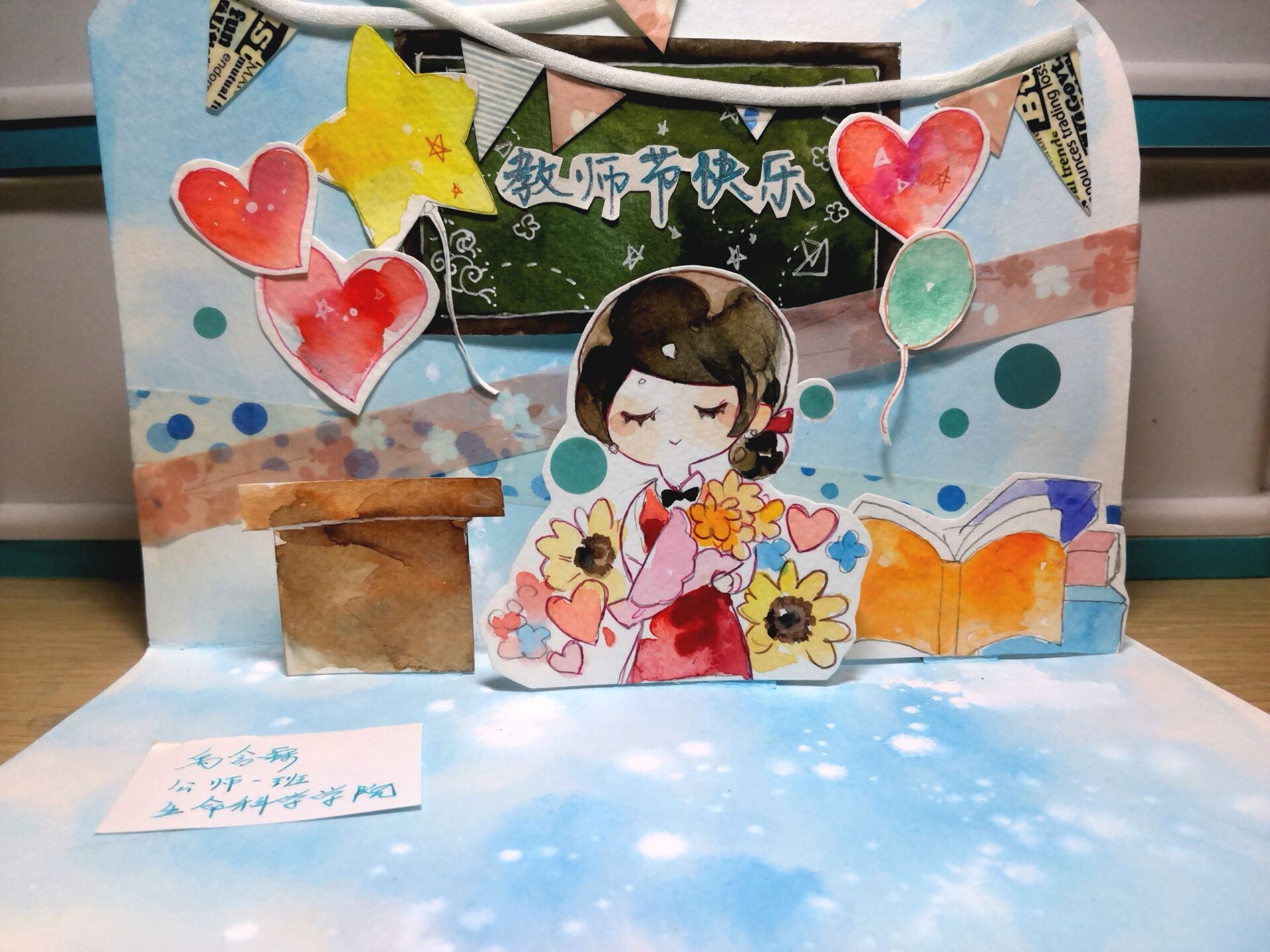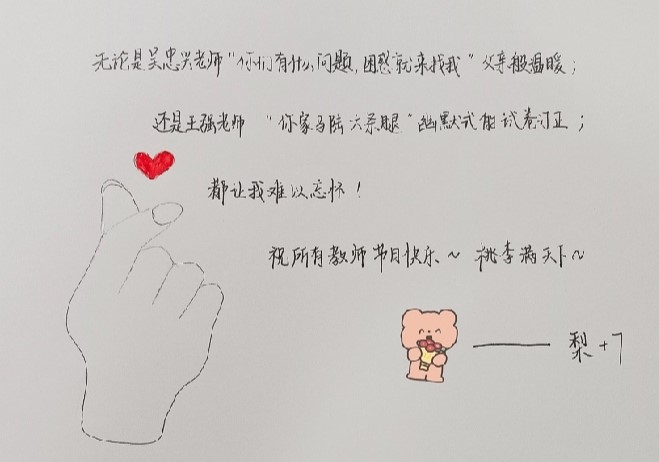 同学们积极参与,热情展现,短短两天时间内收到了多种祝福作品。不少同学充分发挥特长,以贺卡、书法、绘画、手工、视频等多种形式为尽心竭力的老师们送上感恩与祝福。20级白南班的张佳旗和廖怡然同学别出心裁的选择了手工和绘画的方式,塑造出儒雅的学者形象,描绘出教师的温柔体贴,展现了莘莘学子们对传道授业的恩师真诚祝愿。2019级师范三班的同学们则通过手写贺卡说出心里话,或幽默风趣,或真挚感人,对朝夕相处的老师倾诉了深深的喜爱与祝愿,也对老师日常生活和学习上给予的细致关怀表达了感恩,展现出亦师亦友,和谐融洽的师生关系。此外,各班还以班级为单位录制了短视频,集中表达了对老师们的诚挚祝福及崇高敬意。