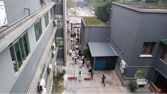 在消防安全疏散演练过程中,同学们在疏导员的指引下弯腰屈身、湿毛巾捂鼻,快速而有序地从高楼层按照指定路线撤离到安全地带。接着保卫处的老师向同学们讲解灭火器使用的注意事项及正确使用方法。谷彩霞老师首先进行了灭火操练,随后同学们依次有序地按照讲解的动作要领进行模拟灭火,对“起火点”实施有效扑救。