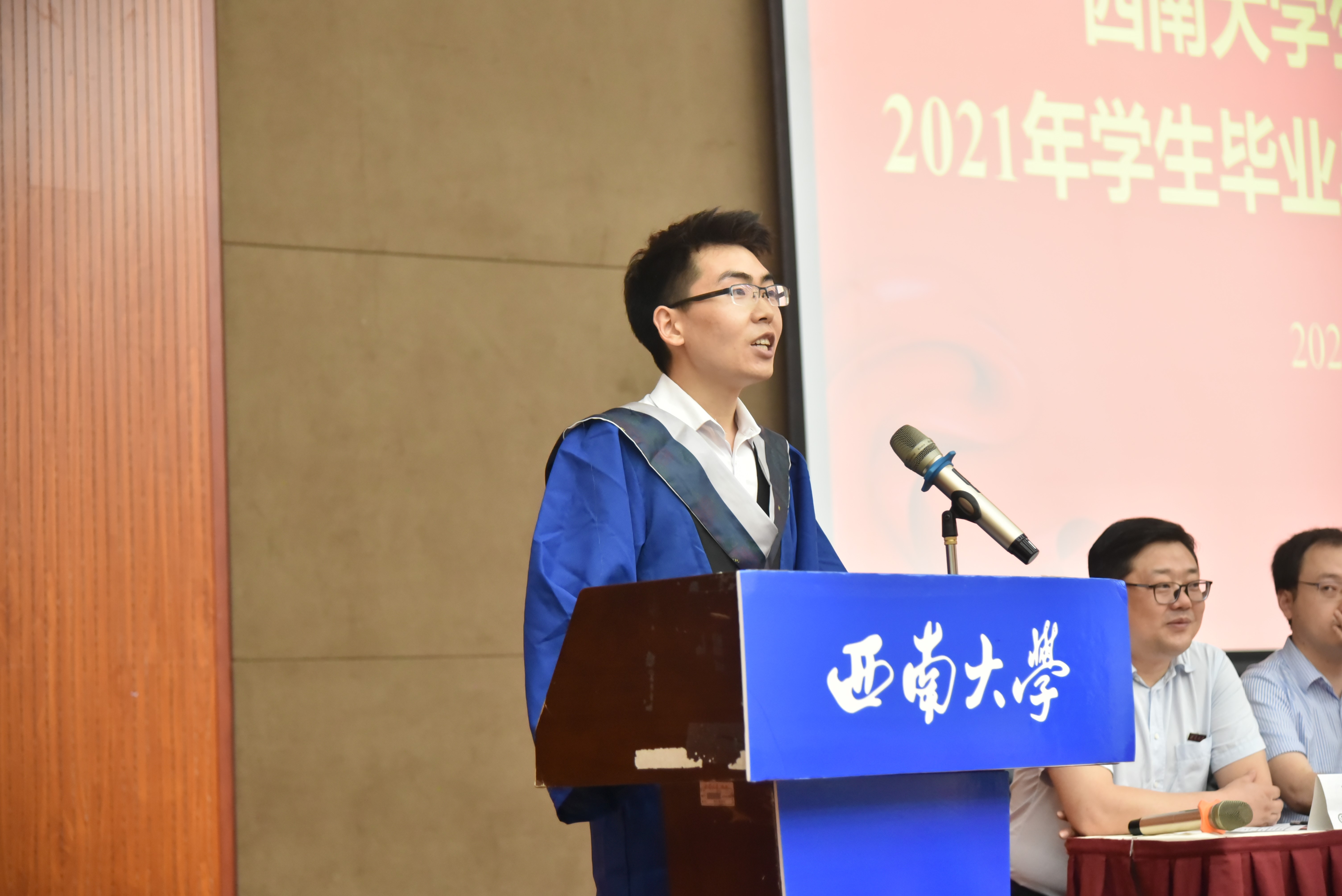 学院特别邀请到2008届优秀校友、重庆市巴蜀中学竞赛部主任王旭作为校友代表寄语毕业生,王旭分享了自己在学院求学时的经历,回顾了13年前在西师街上的漫步、在崇德湖旁的沉思、在图书馆里的自习、在大教室中的比赛,他从自身实际出发,针对大家可能出现的困惑,鼓励学弟学妹们找到目标、做好规划,保持努力;在工作岗位上,他建议学弟学妹们要不断加强业务水平、锐意进取,争当先进;毕业后要保持好奇而不功利的心境,广交朋友,广结善缘。