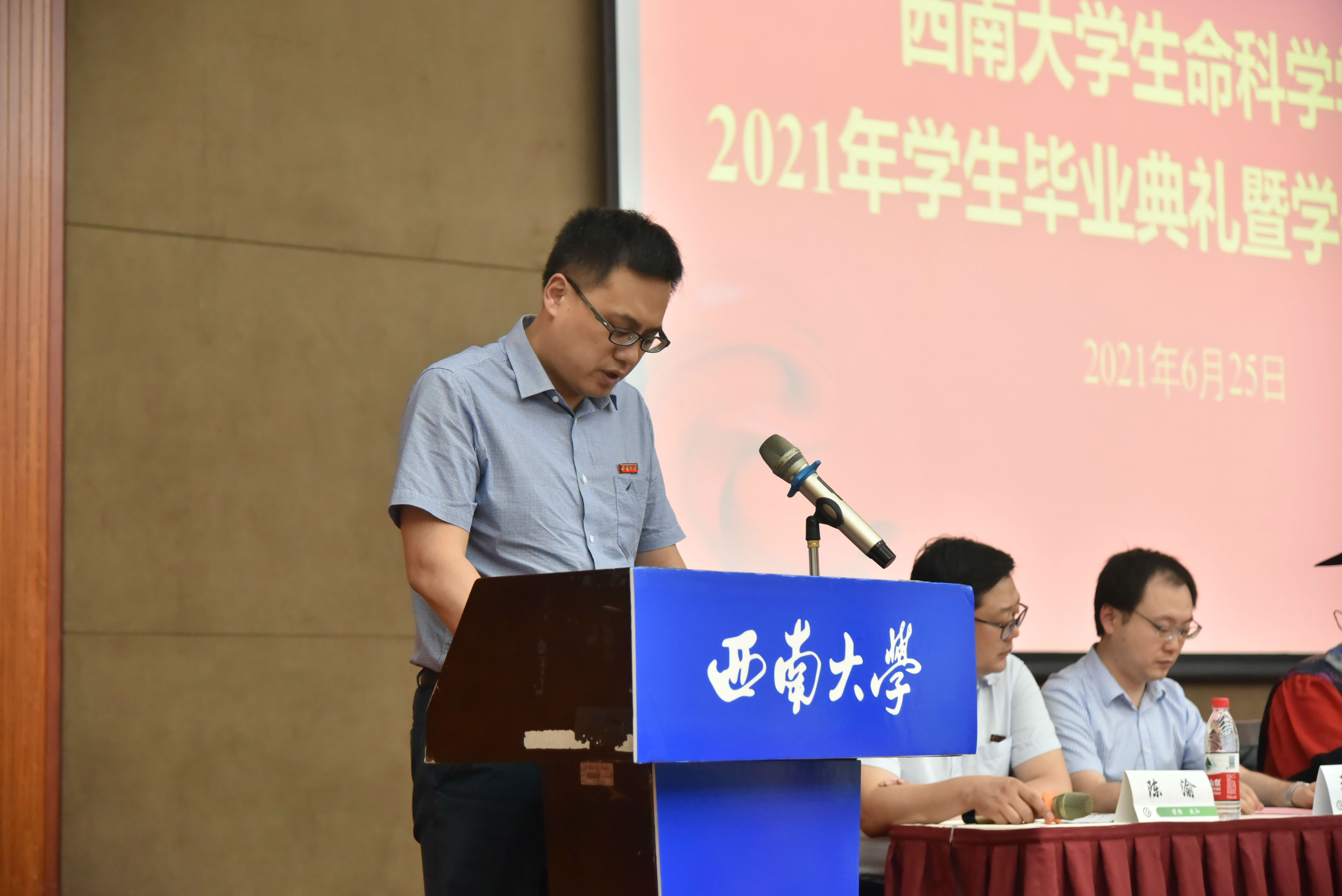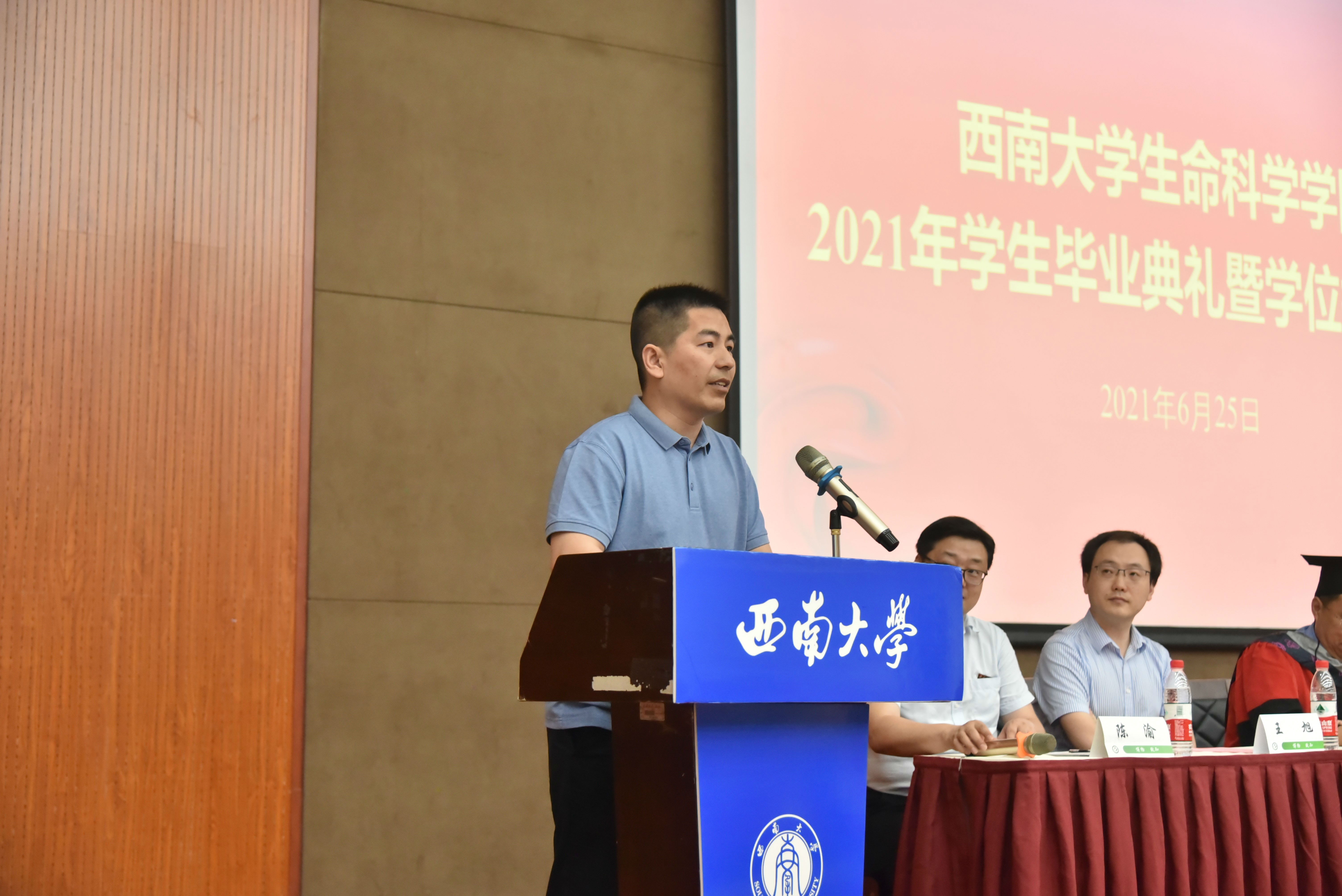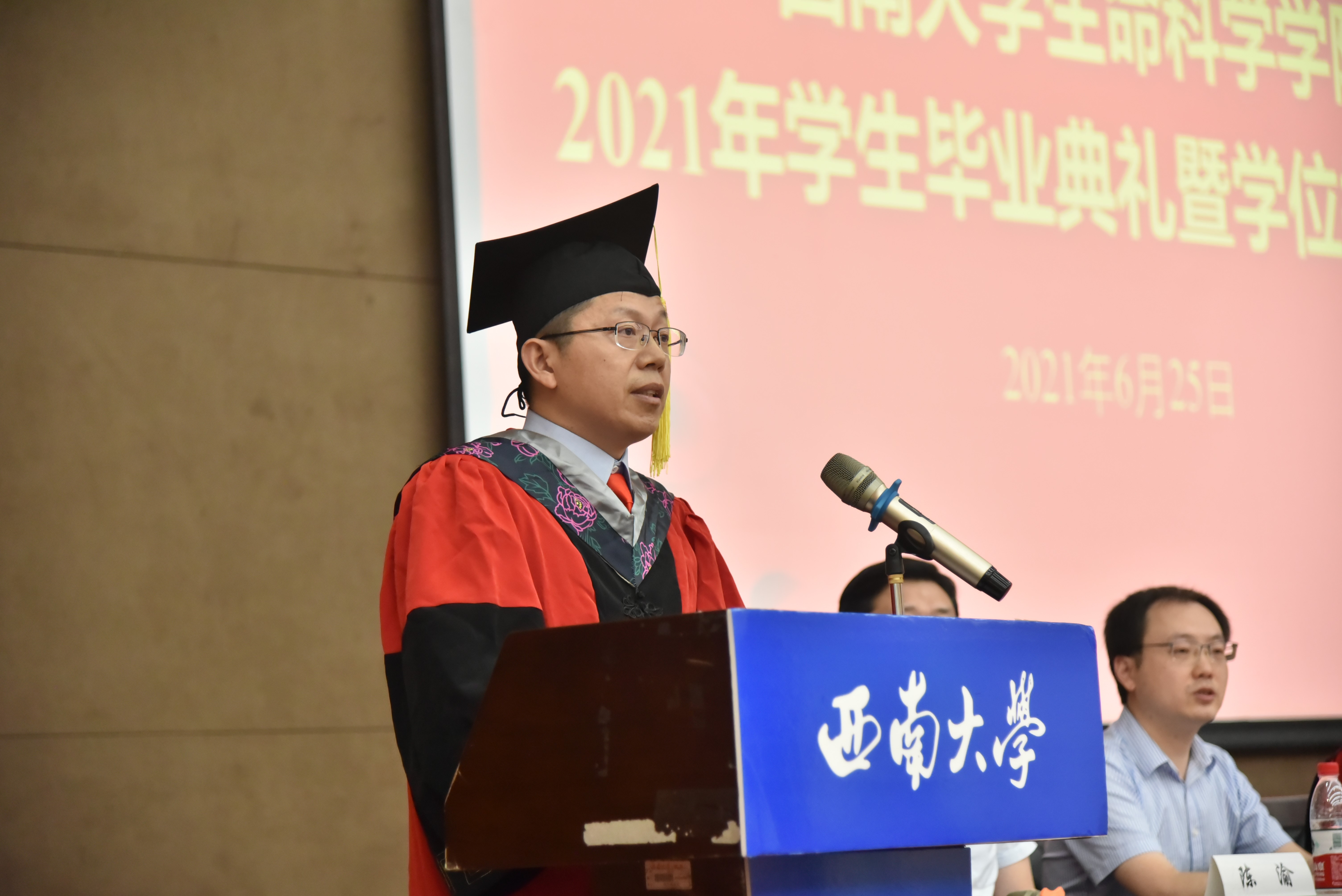 罗克明院长在典礼最后的讲话中指出,再过几天,就是中国共产党的百岁华诞,也是大家离开母校,开辟属于自己广阔天地的日子,大家即将登上属于自己人生旅程的崭新舞台,迎来属于自己人生的“大事变”。他强调,与今后的漫长旅程相比,大家此前的学习生活更像是一出序幕,剧是必须从序幕开始,但序幕还不是高潮,同学们要时刻保持积极向上的心态,一是要热爱祖国、懂得感恩,永怀报国之心,把自己的理想同祖国的前途、把自己的人生同民族的命运紧密联系在一起;二是要勇于奉献、敢于担当,扛起时代重任,以永不懈怠的精神状态和一往无前的奋斗姿态,担负起时代赋予的重任;三是要努力奋进、懂得坚持,不断突破自己,做一个永不停歇的攀登者,把握机遇,就能破茧成蝶,看到人生最美的风景。愿毕业生同学们涌入人海,继续乘风破浪,即使没有人再催打卡,也要早点回家,生科院永远是大家温暖的港湾。祝愿同学们鹏程万里、事业腾达!祝愿西南大学事业蒸蒸日上,明天更加美好!