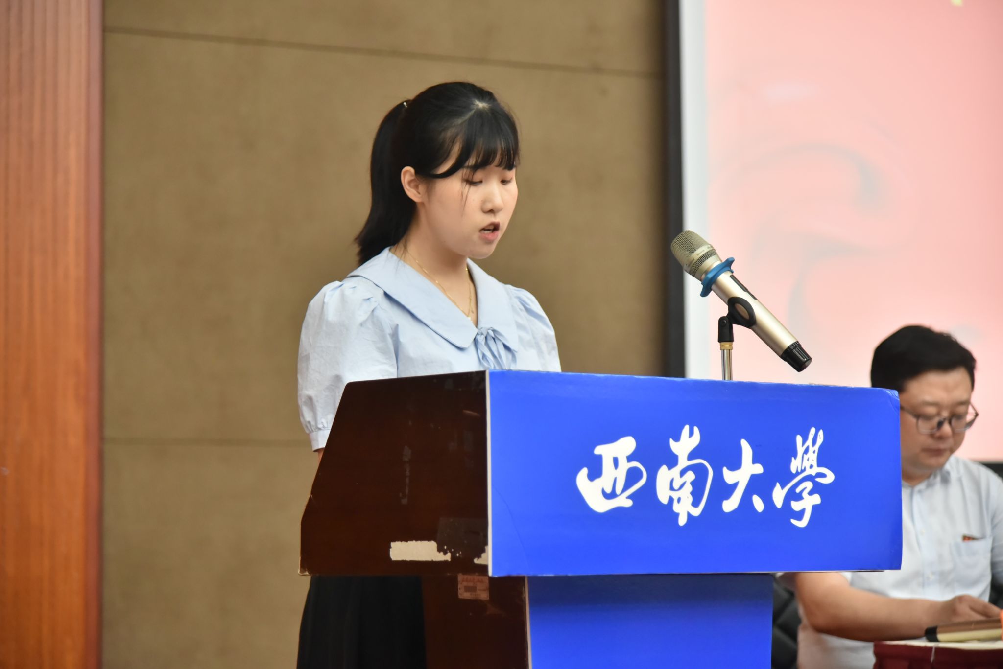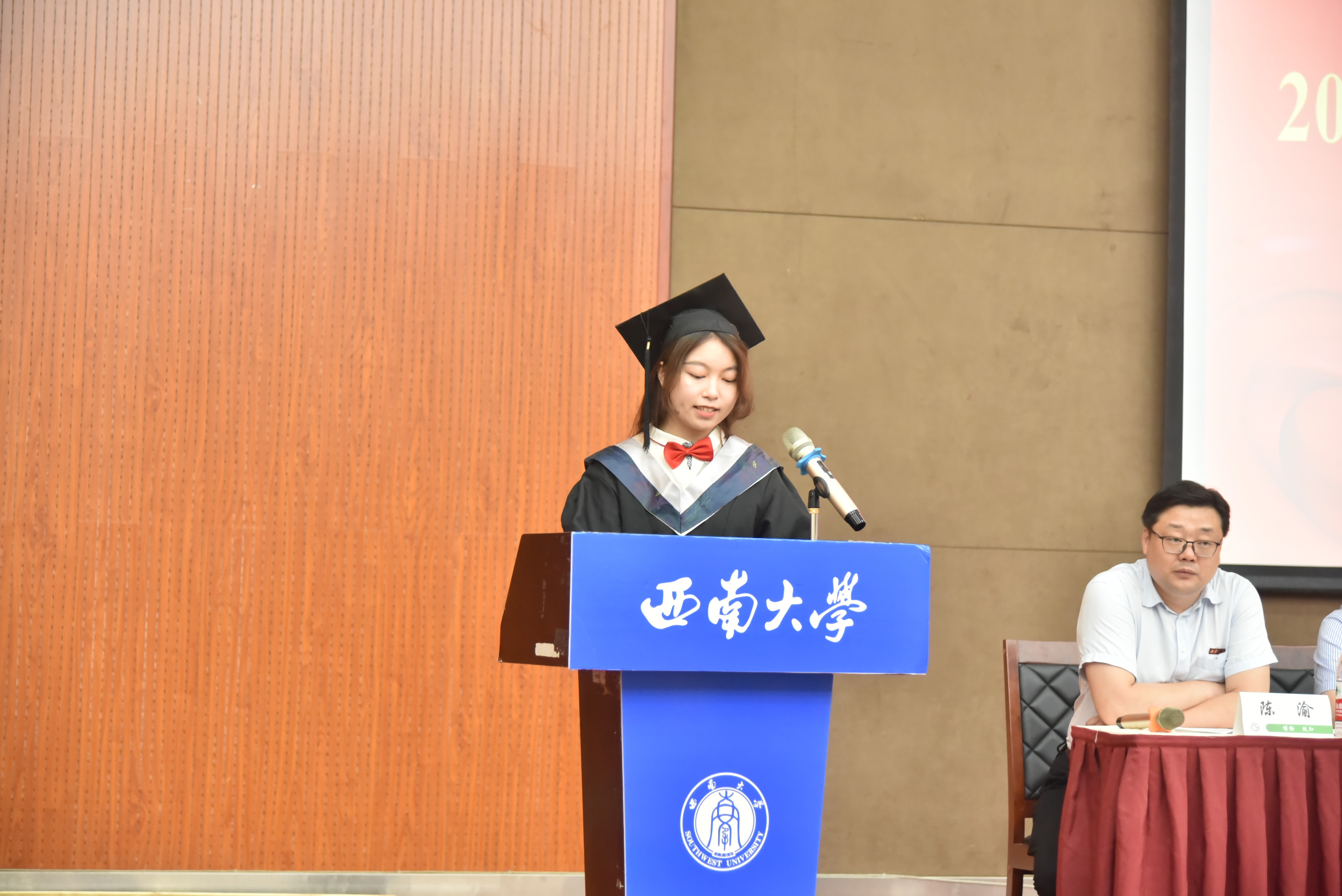 低年级学生代表邹爽向顺利完成学业的毕业生同学们表达了热烈的祝贺和真挚的祝福,并用“路漫漫其修远兮,吾将上下而求索”与学长学姐们共勉,表示无论以后面对的是风和日丽还是艰难险阻,都会义无反顾开拓前进的道路、坚定前进的步伐、永攀时代的高峰。
